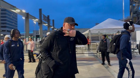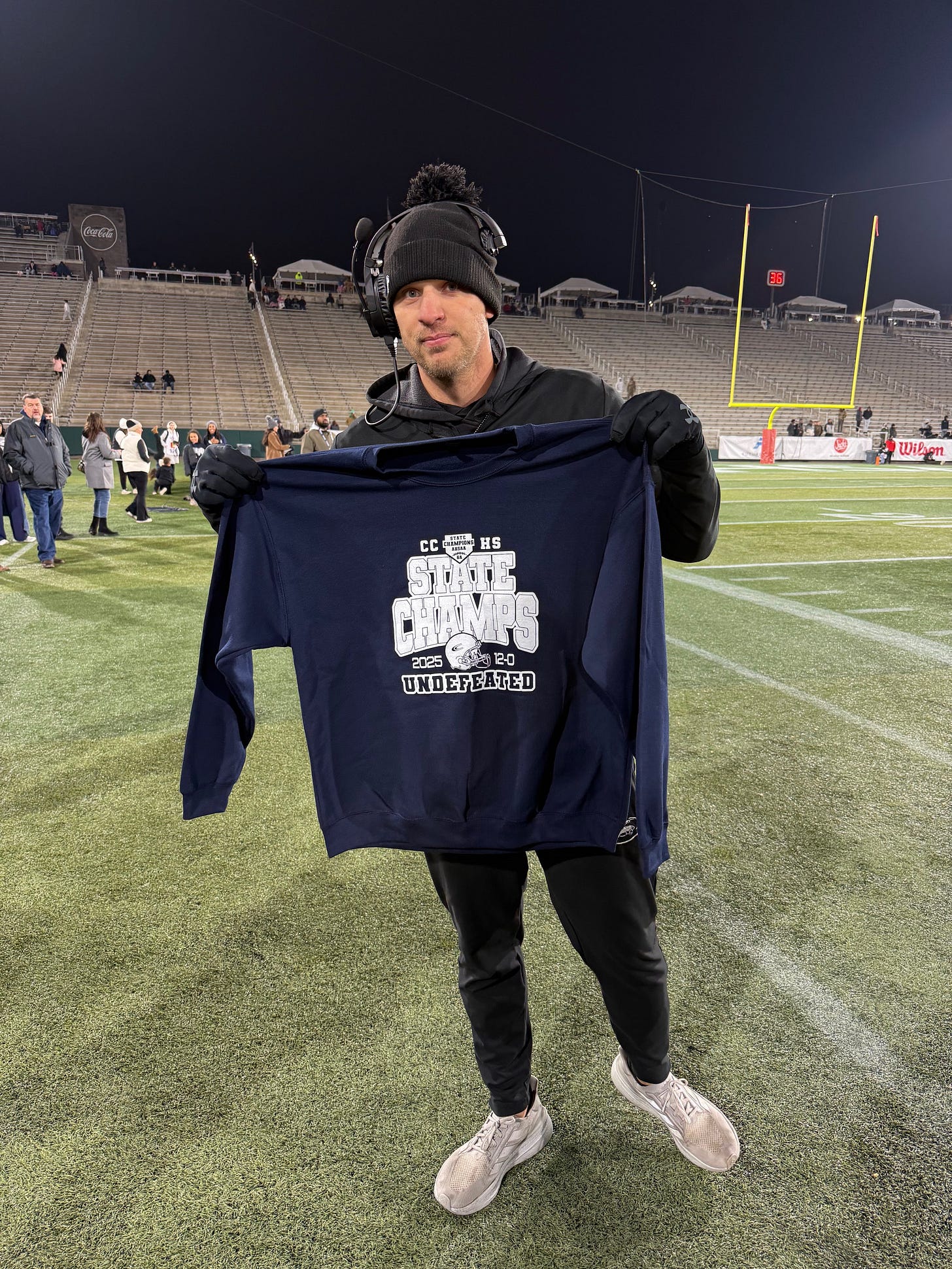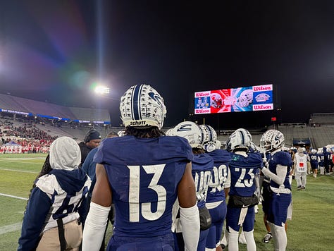 The postgame celebration was a rush. I recorded way too many videos on my phone, including the 15-minute press conference with Floyd, linebacker Isaiah Brown, Johnson, Frye, and Ray. I watched the trophy passed around for selfies and videos. The ride back to Clay was a quick one. It works that way when you have a police escort. Coaches and players took photos until well after midnight. Many did so in the weight room. Floyd had his photo taken on the couch in his office, a recreation of a state championship photo taken of him in 2014, on the same night, December 5.